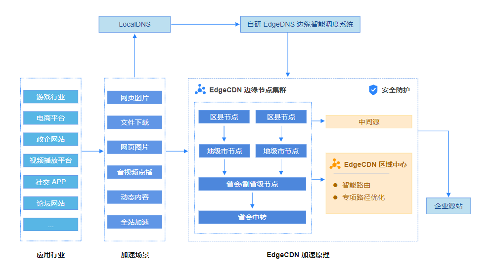 A:灵境云EdgeCDN提供了全局加速解决方案。对于静态资源,它采用多级缓存技术,提高命中率,减少回源压力;对于动态资源,则通过优化的优质节点与智能路由算法,实现高效、安全的动态加速。无论是电商交易、政务办理还是社交互动,都能获得显著的速度提升。其应用场景广泛覆盖网站、音视频点播、云游戏、大文件下载等领域。
